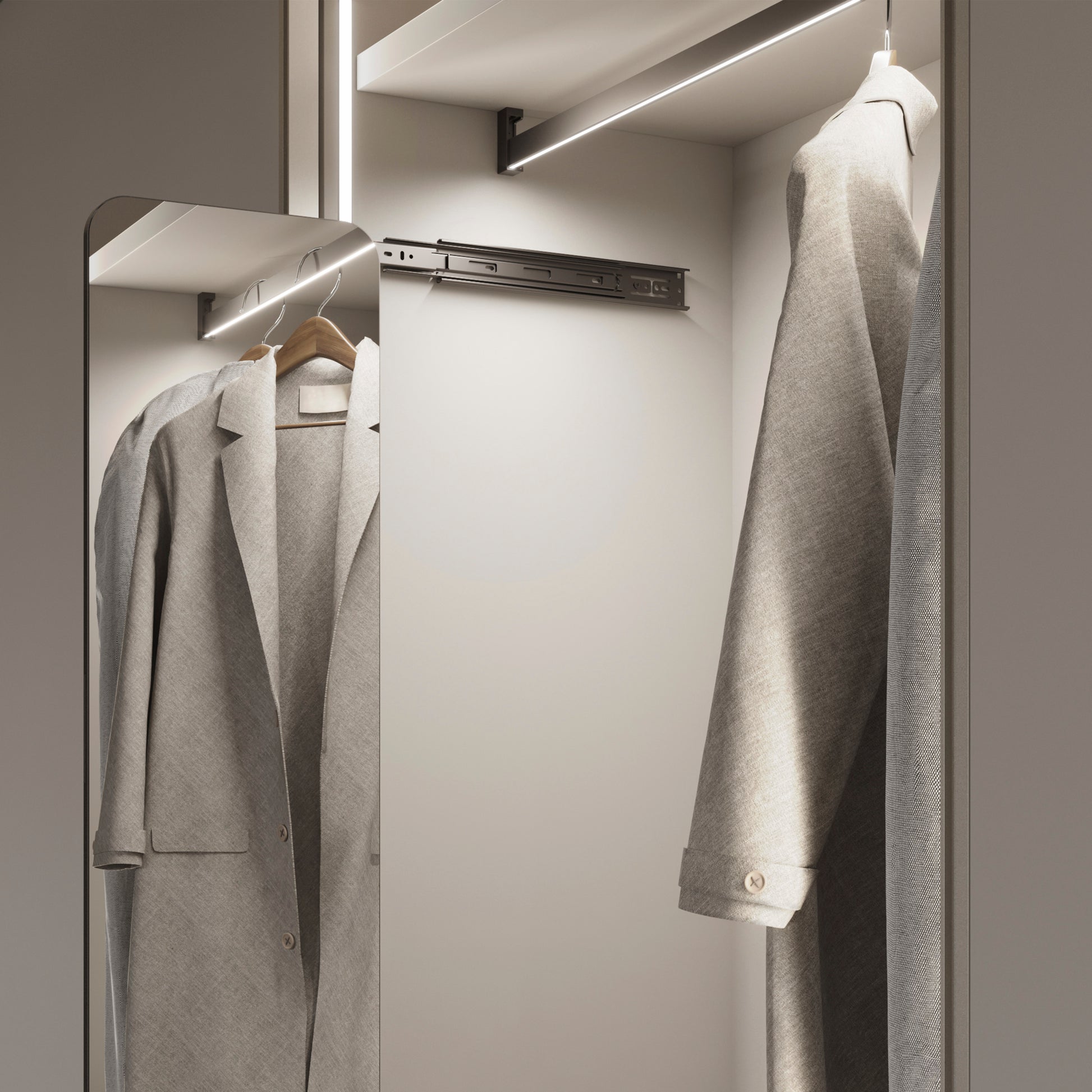 La barra può essere accorciata ogni 25 mm, consentendo di adattarla con precisione alla larghezza interna dell’armadio. Inoltre, dispone di una guarnizione ammortizzante nella parte superiore che attenua il rumore nell’uso quotidiano.