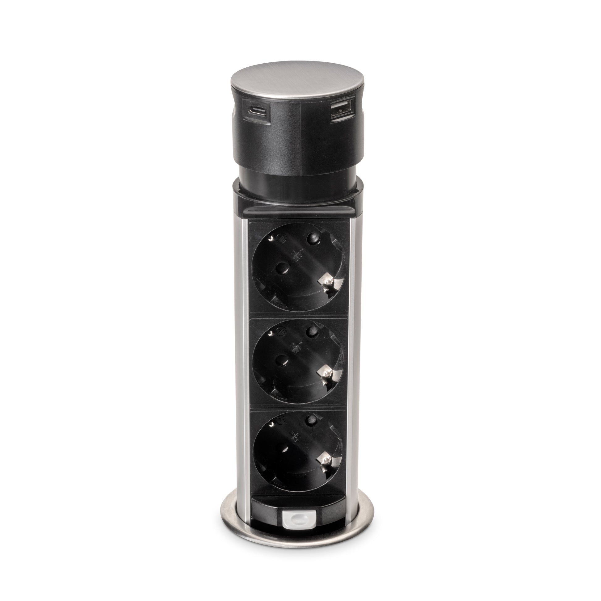 Emuca Multiconnettore estraibile Vertikal Push 60, diametro 60 mm, 3 prese Schuko, 1 USB tipo A, 1 USB tipo C, Acciaio e Tecnoplastica, Acciaio inossidabile